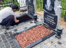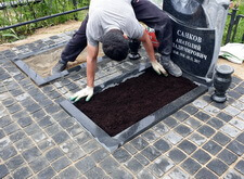 Первым делом мы подготовили участок к работам: демонтировали уже установленное надгробье, а также разровняли почву на могиле, тем самым подготовив её к укладке наземного покрытия.