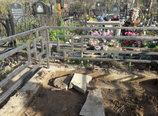 Возвращаемся на могилу. Подготавливаем оградку к покраске, зачищая её от старого покрытия. Параллельно устанавливаем подставку для памятника.